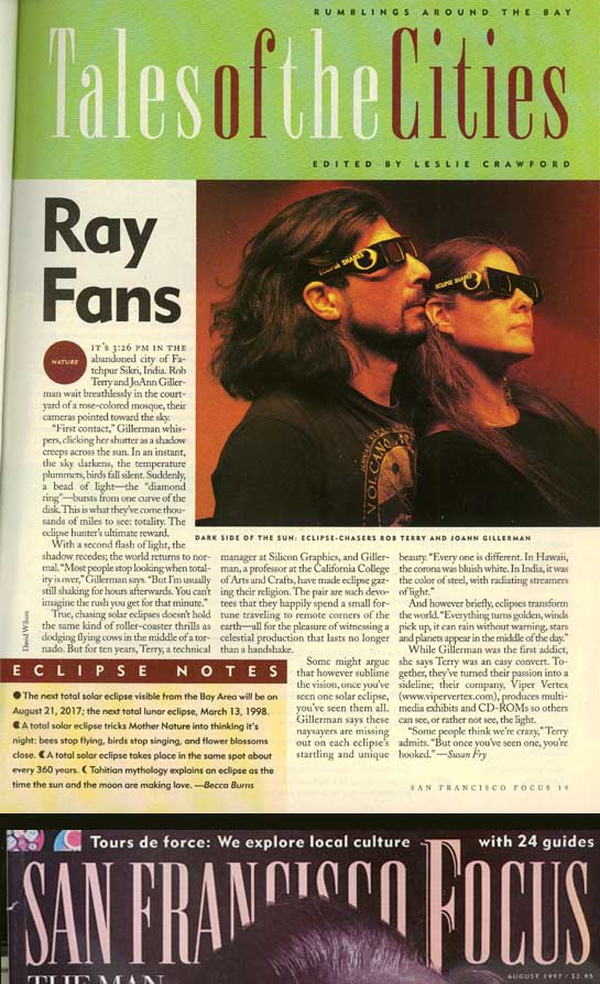 Bay Area Profile of JoAnn Gillerman and Rob Terry of Viper Vertex as they travel the world to document and experience total solar eclipses and use the materials to create multimedia works. Return