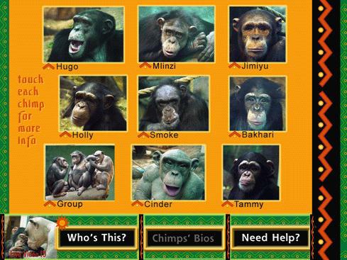 "Chimp Finder" lets a visitor find out names and information about the individual chimpanzee and the politics of the chimp group. It helps visitors connect directly with chimps to bring awareness to issues of conservation. In addition to identification of the individual chimps, Chimp Finder also lets a visitor explore the particular personality of each chimp through video, pictures and stories.
